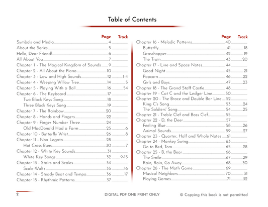 The first piano lessons begin with Irina Gorin's Tales of a Musical Journey series. This piano method book series for beginners is available in 14 different languages and in many countries internationally. Tales of a Musical Journey is written in the form of a chapter book and uses a fairytale setting and characters to introduce and expand musical concepts.